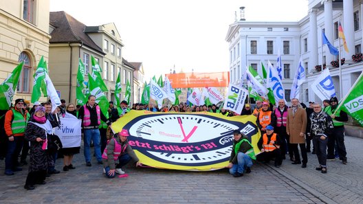 Um ihrer Empörung über diese Verweigerungshaltung auszudrücken und ihre berechtigten Forderungen zu untermauern, hatten Landesbeschäftigten aus Mecklenburg-Vorpommern eine Protestwoche unter dem Motto „JETZT SCHLÄGT’S 13!!“ gestartet und eine tägliche Mahnwache für der Staatskanzlei eingerichtet.